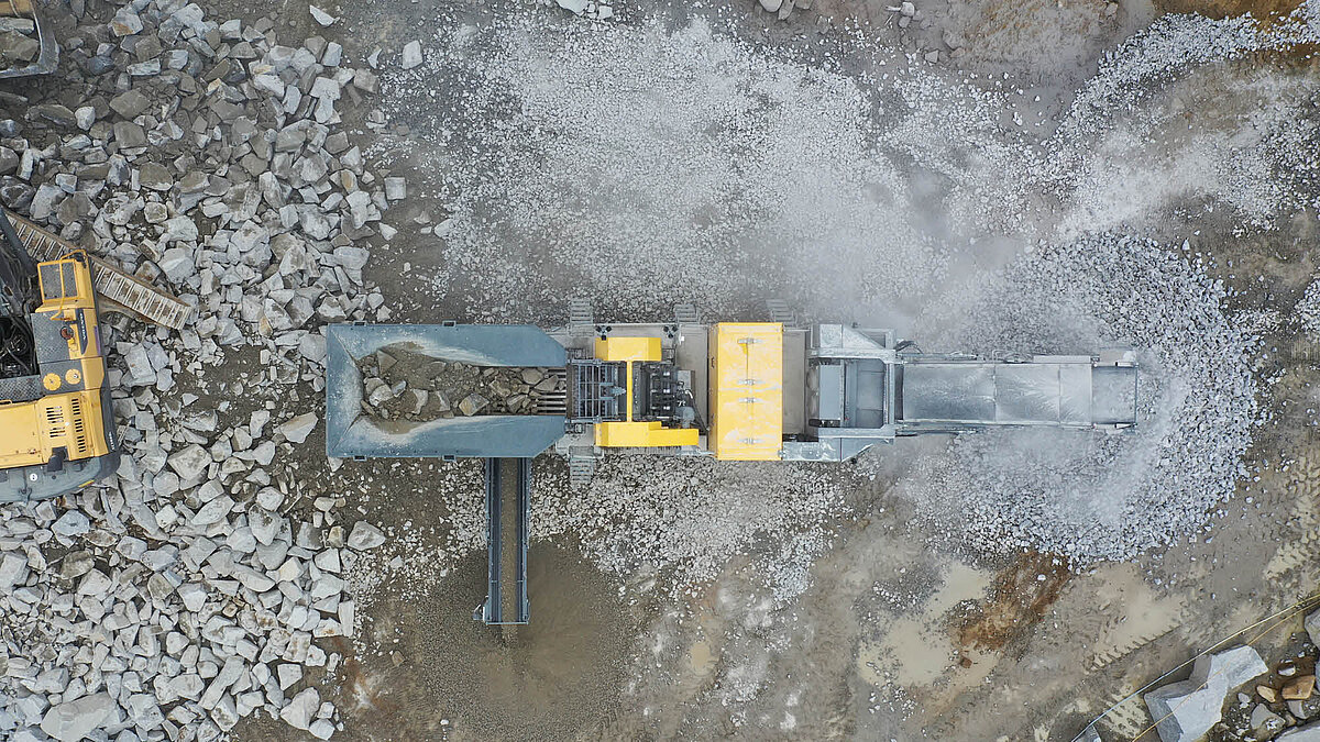 A mobile incline screen or scalping screen split the aggregate into several fractions.